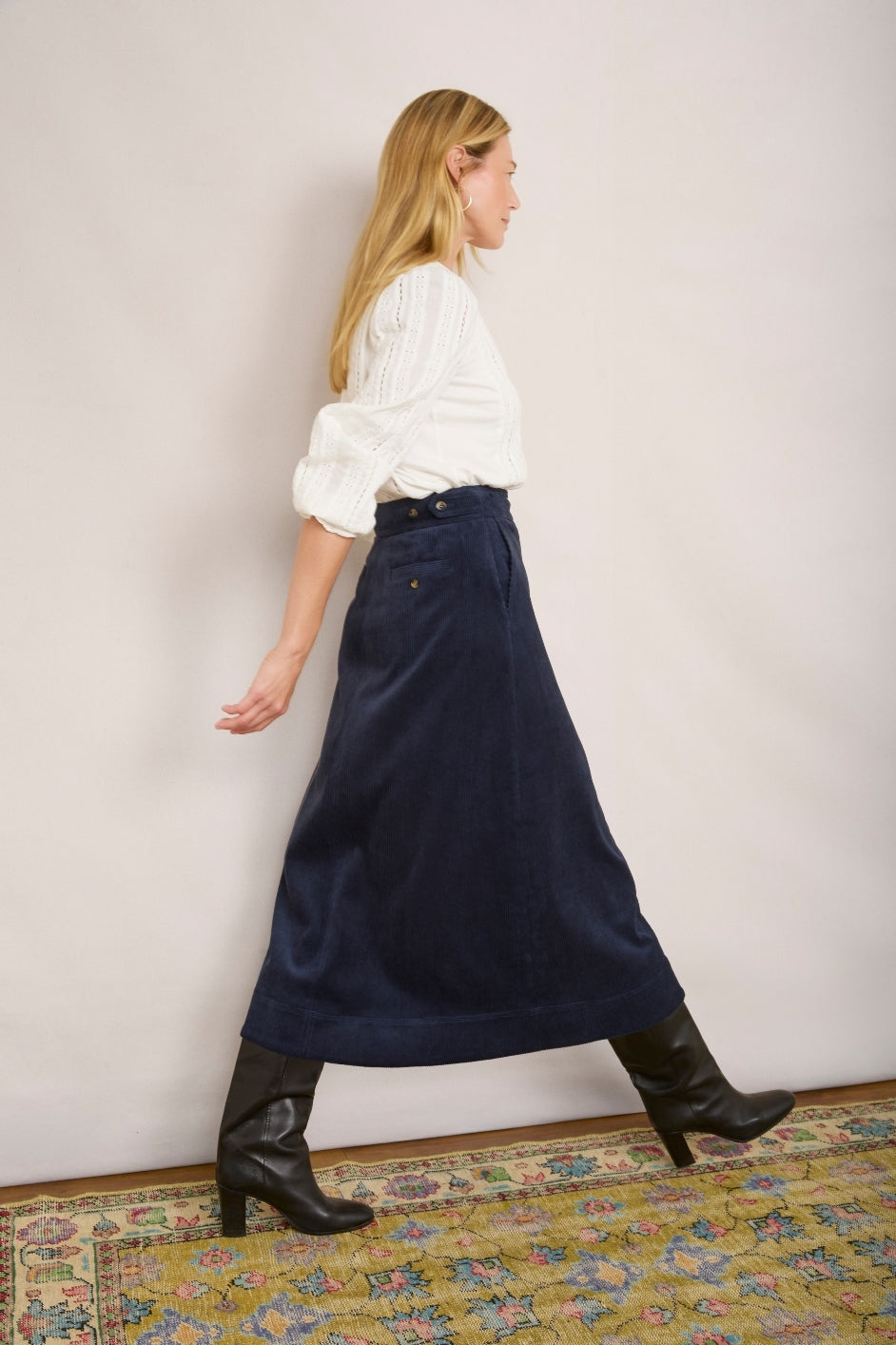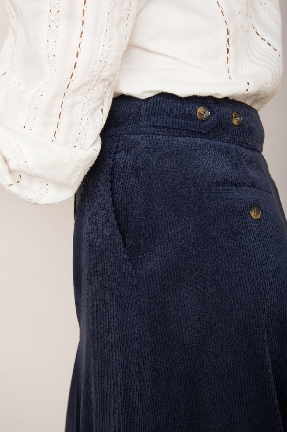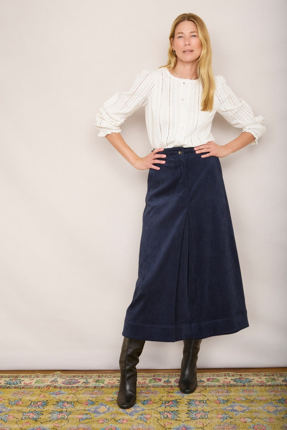 • Our new Carina cord skirt in a staple midnight colour.
