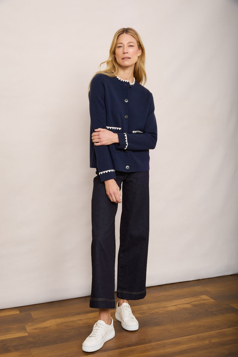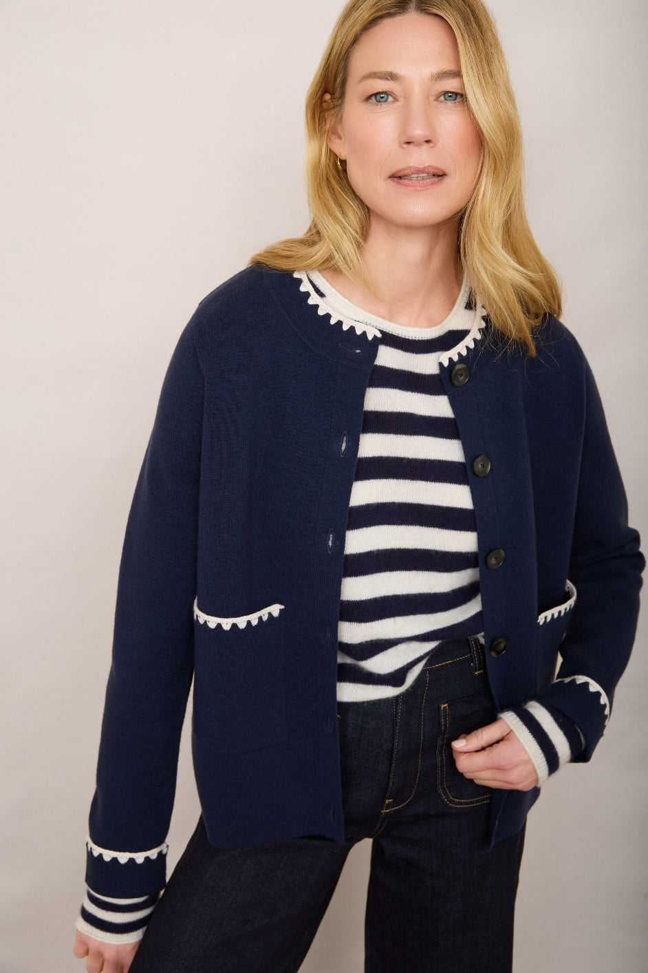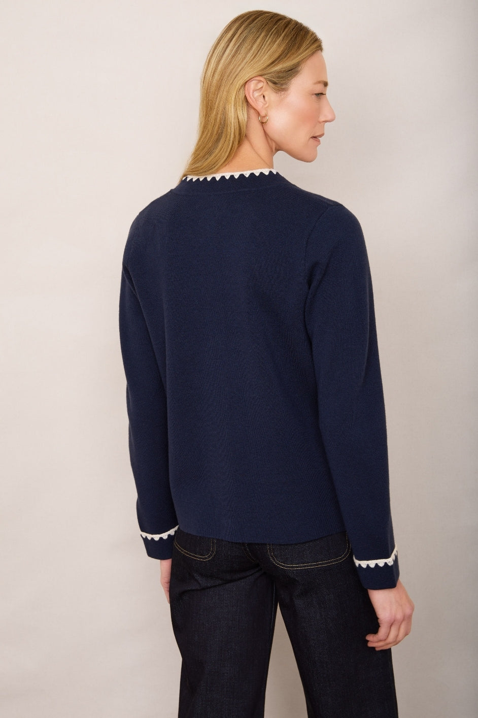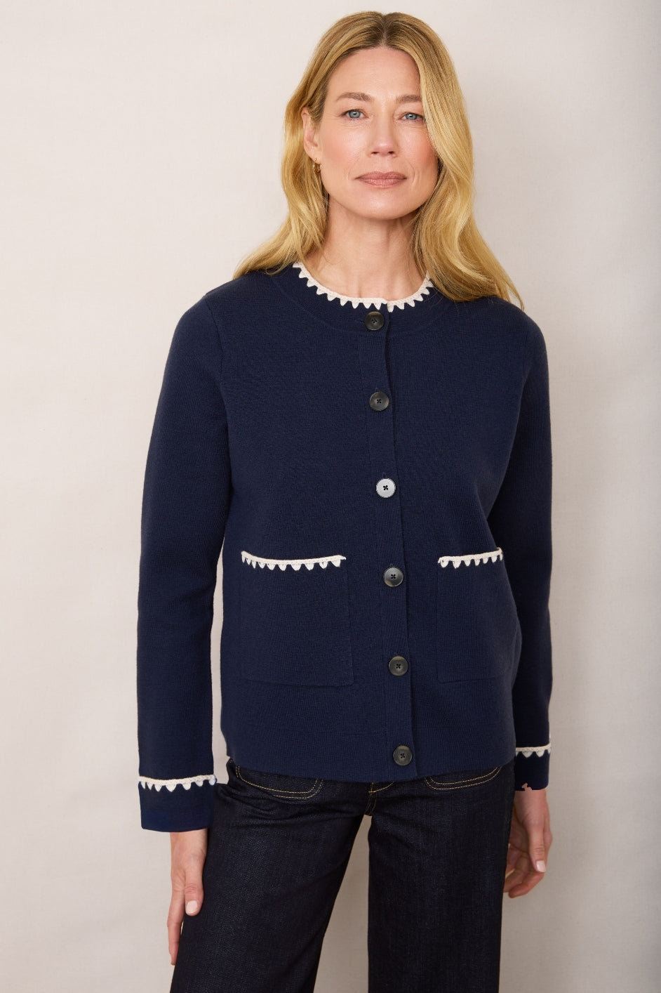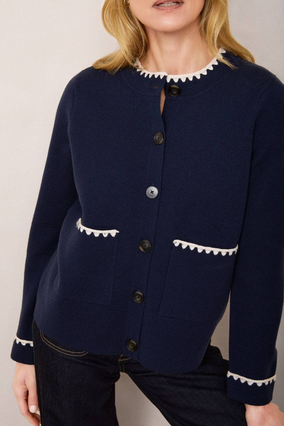 - Ecru crochet detailing along the collar, cuffs, and pocket edges.