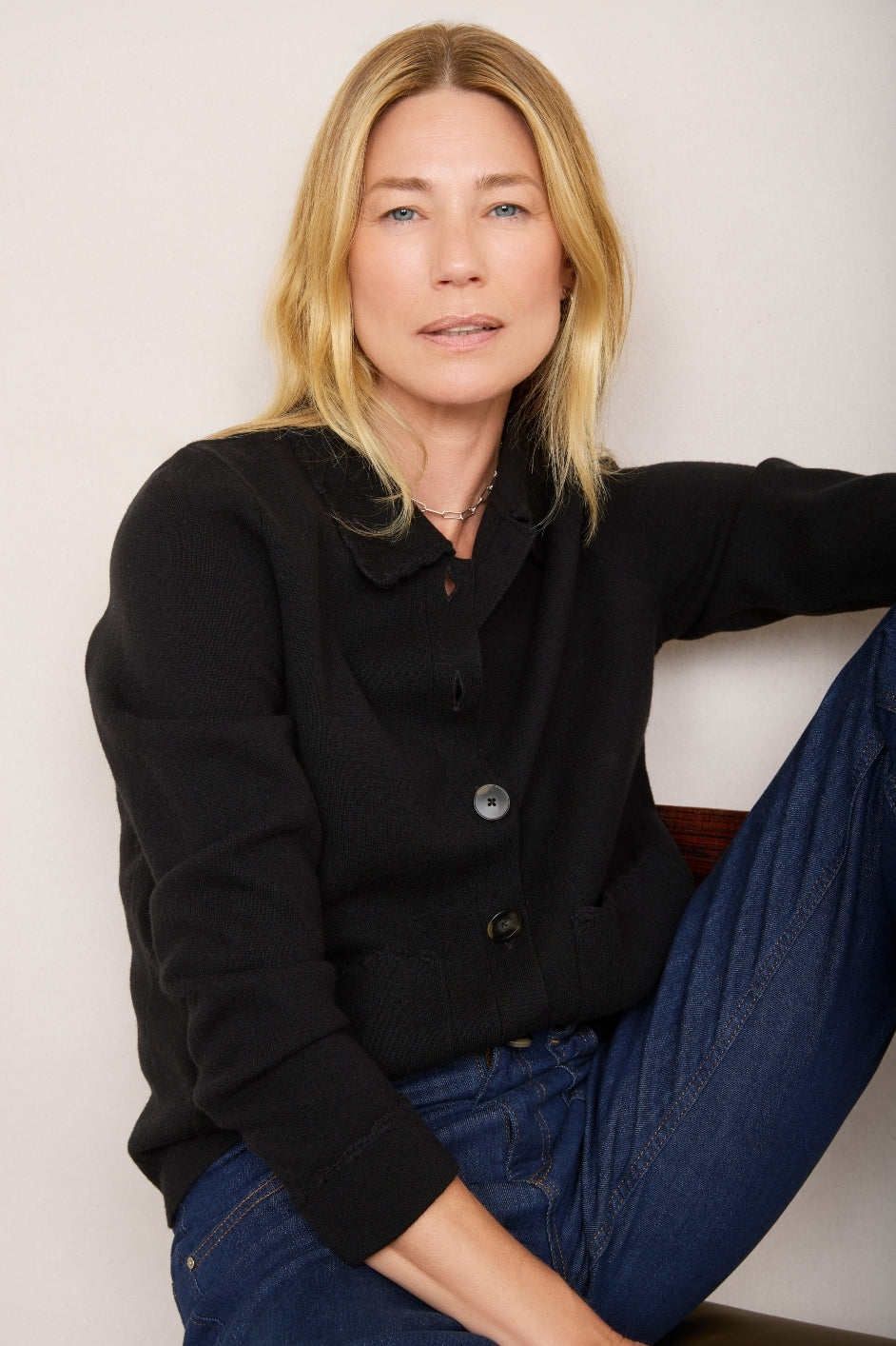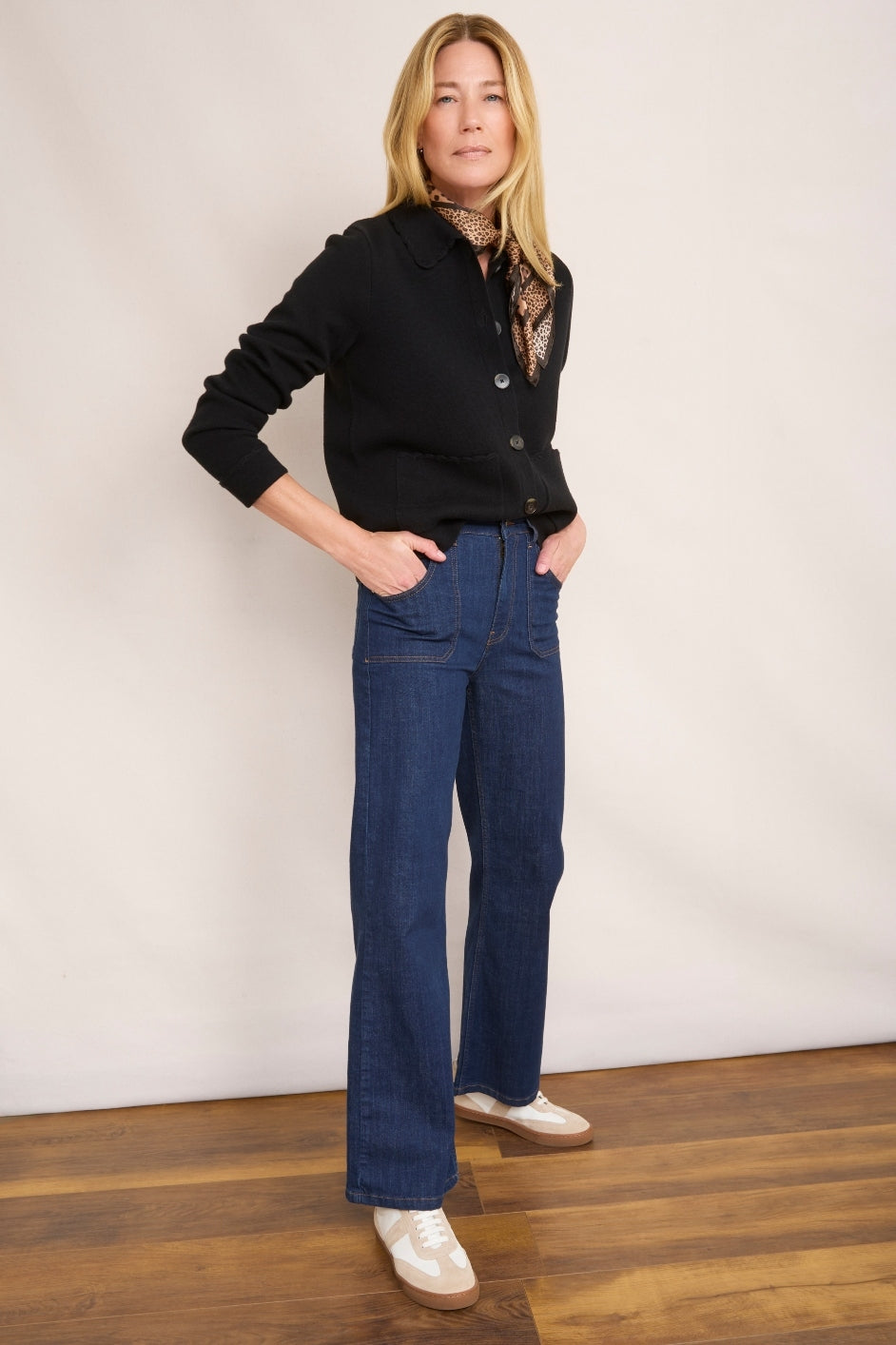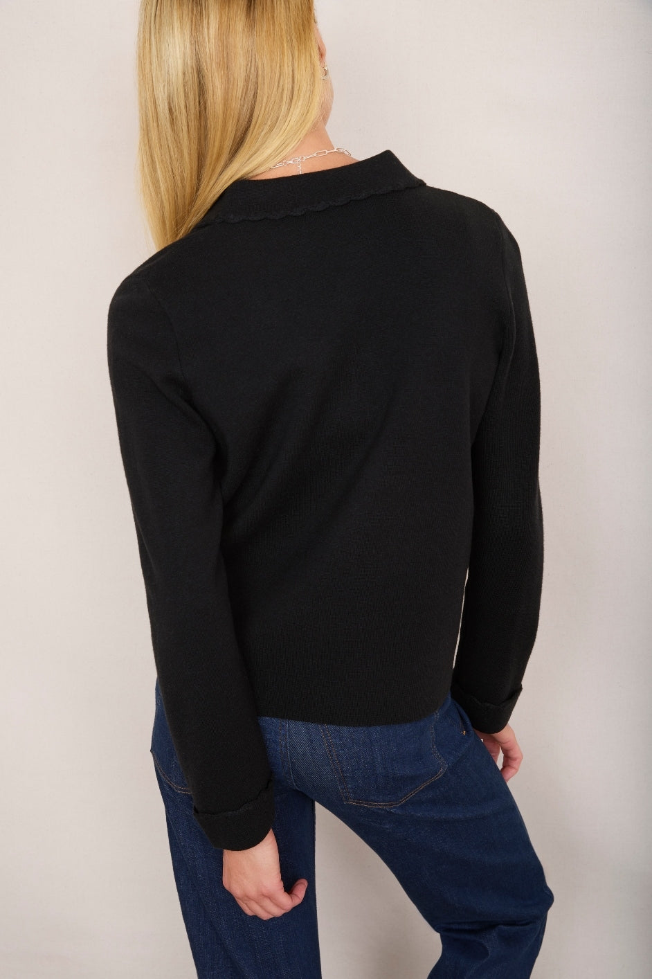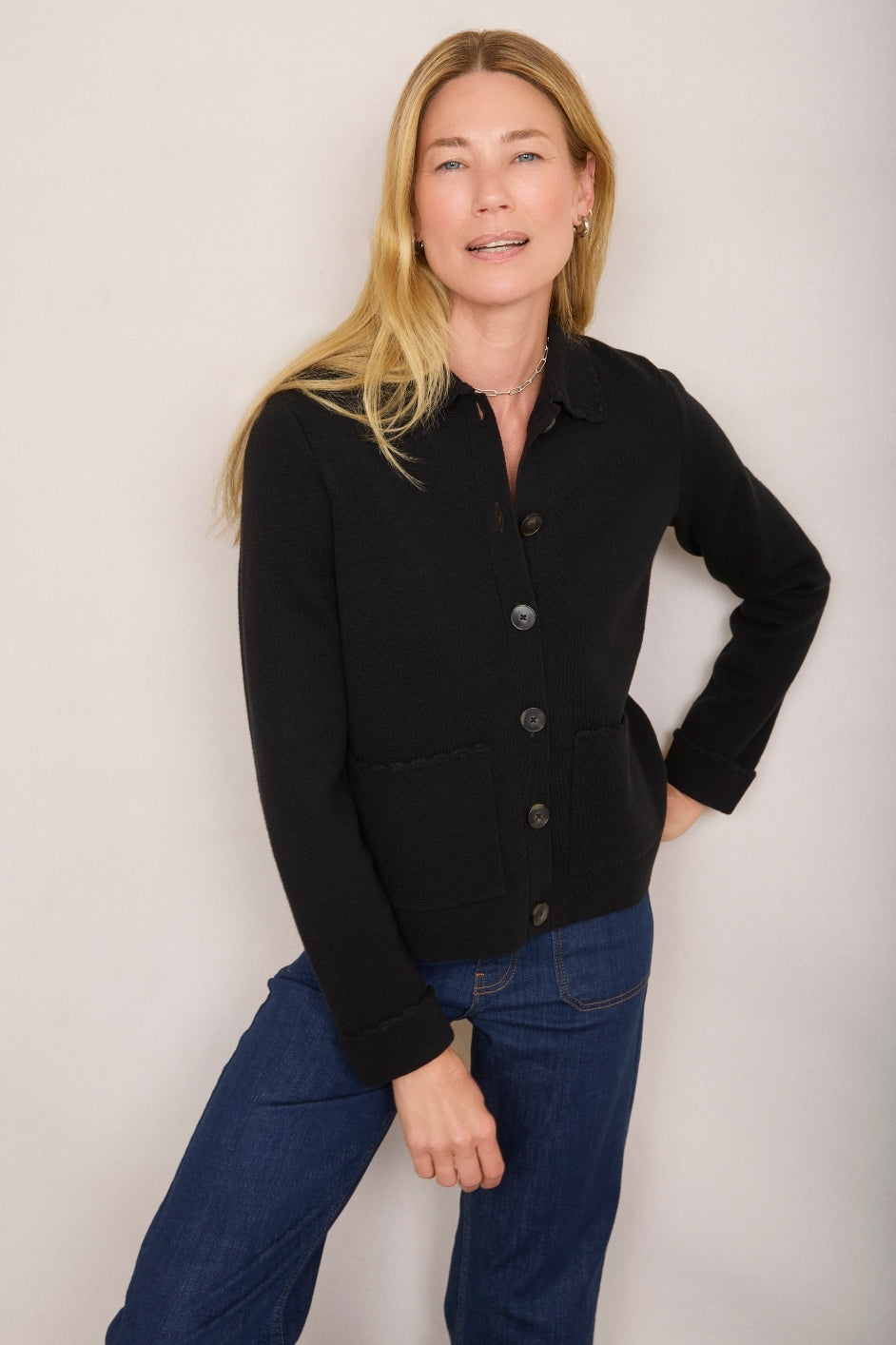 - Scallop crochet detailing on the collar, cuffs, and pocket edges.