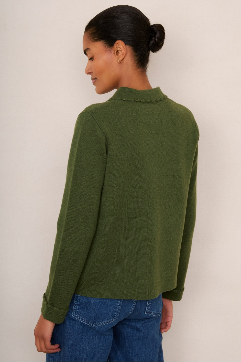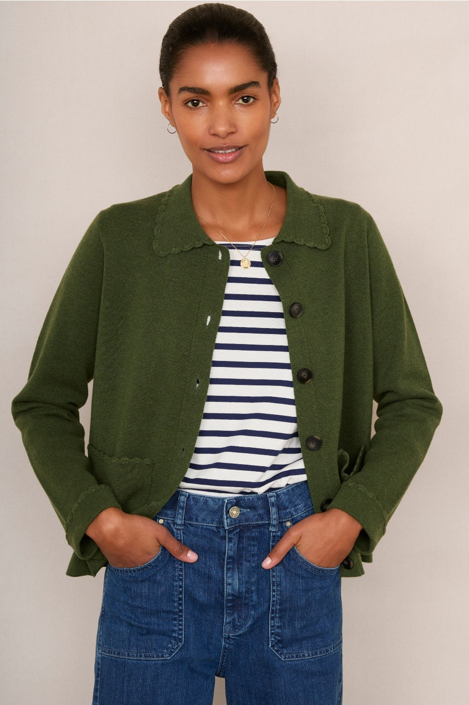 - Scallop crochet detailing on the collar, cuffs, and pocket edges.
