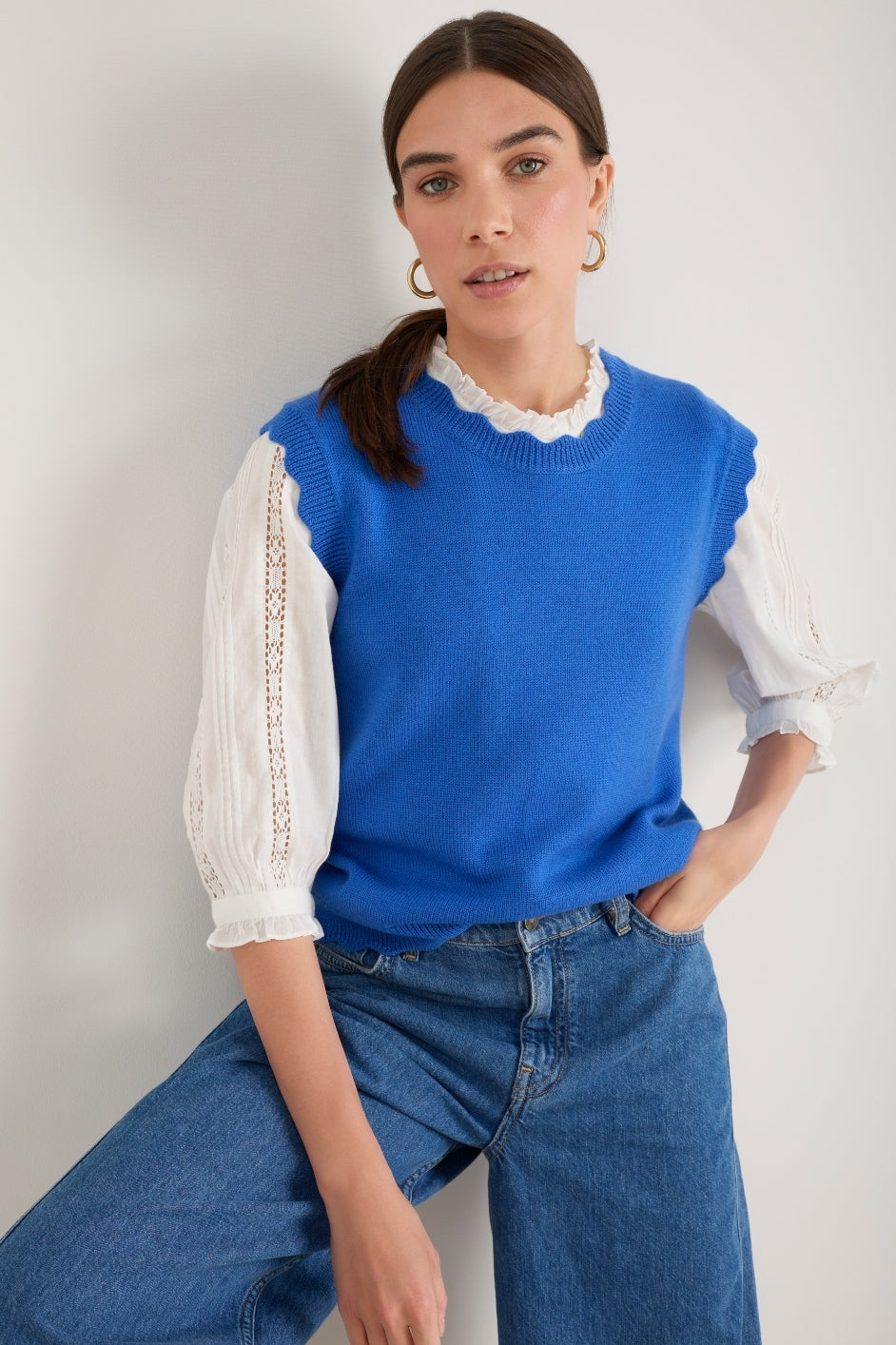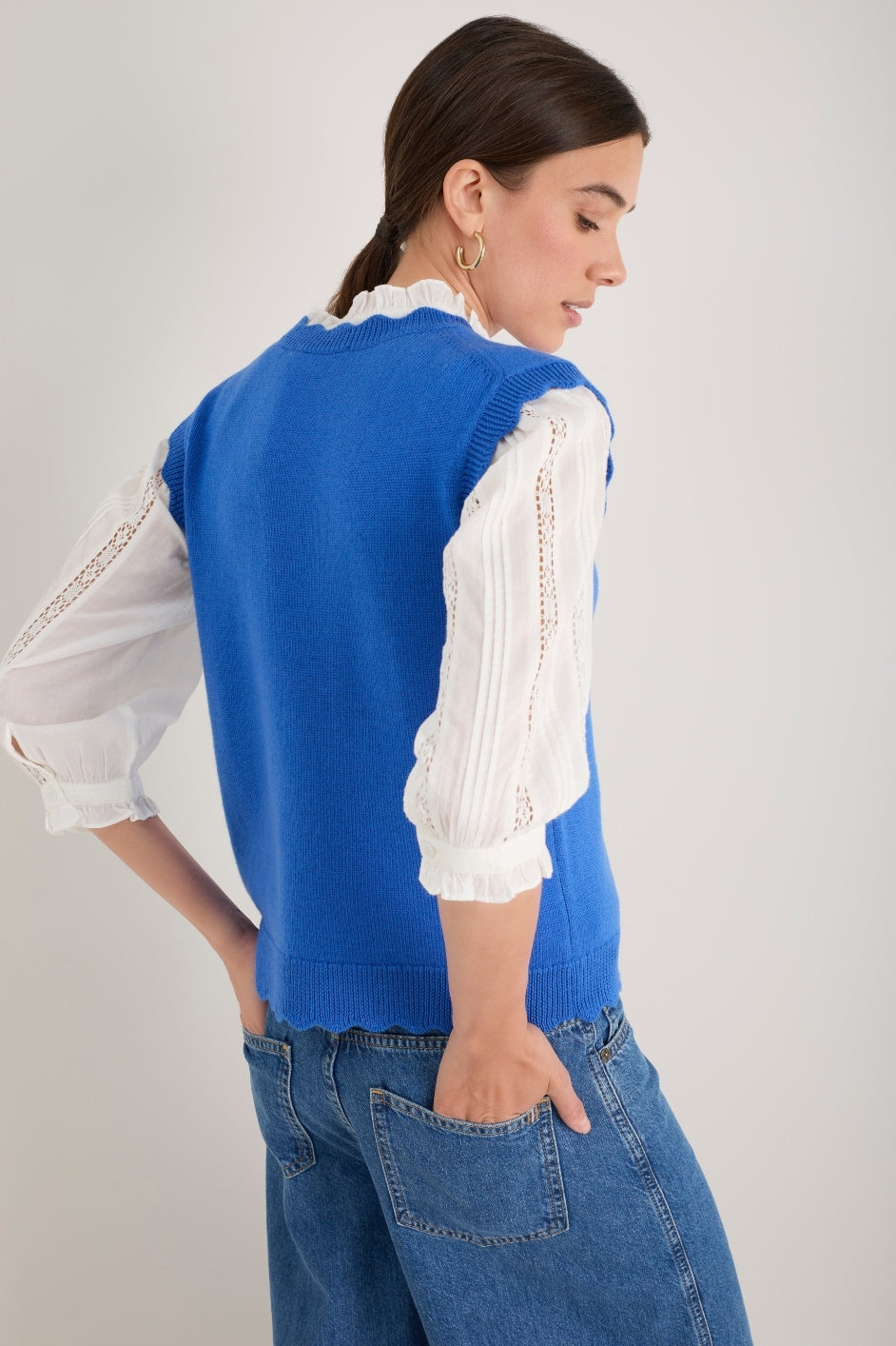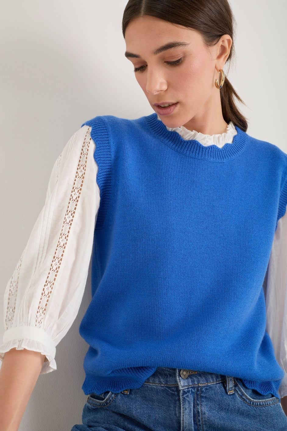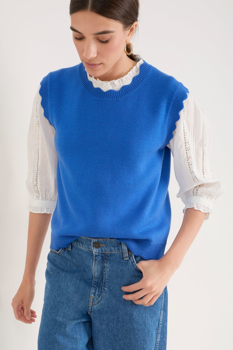 - Scallop detail at the neck, hem and arms.
