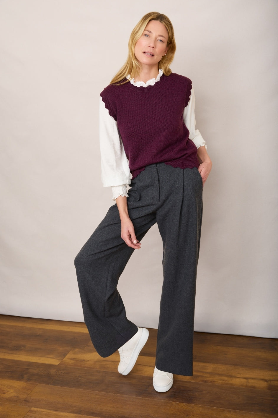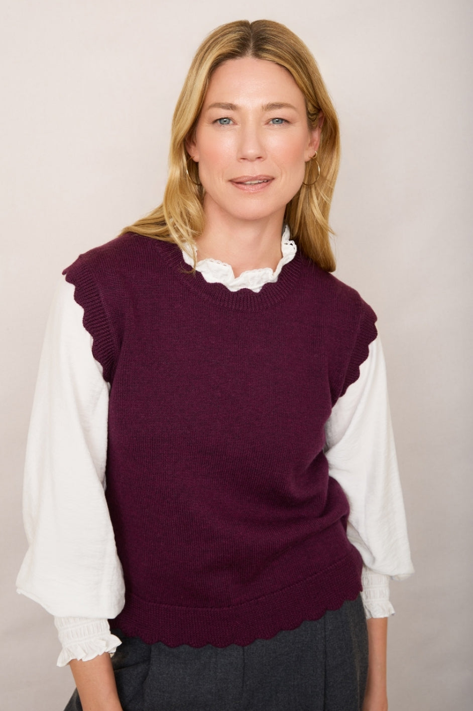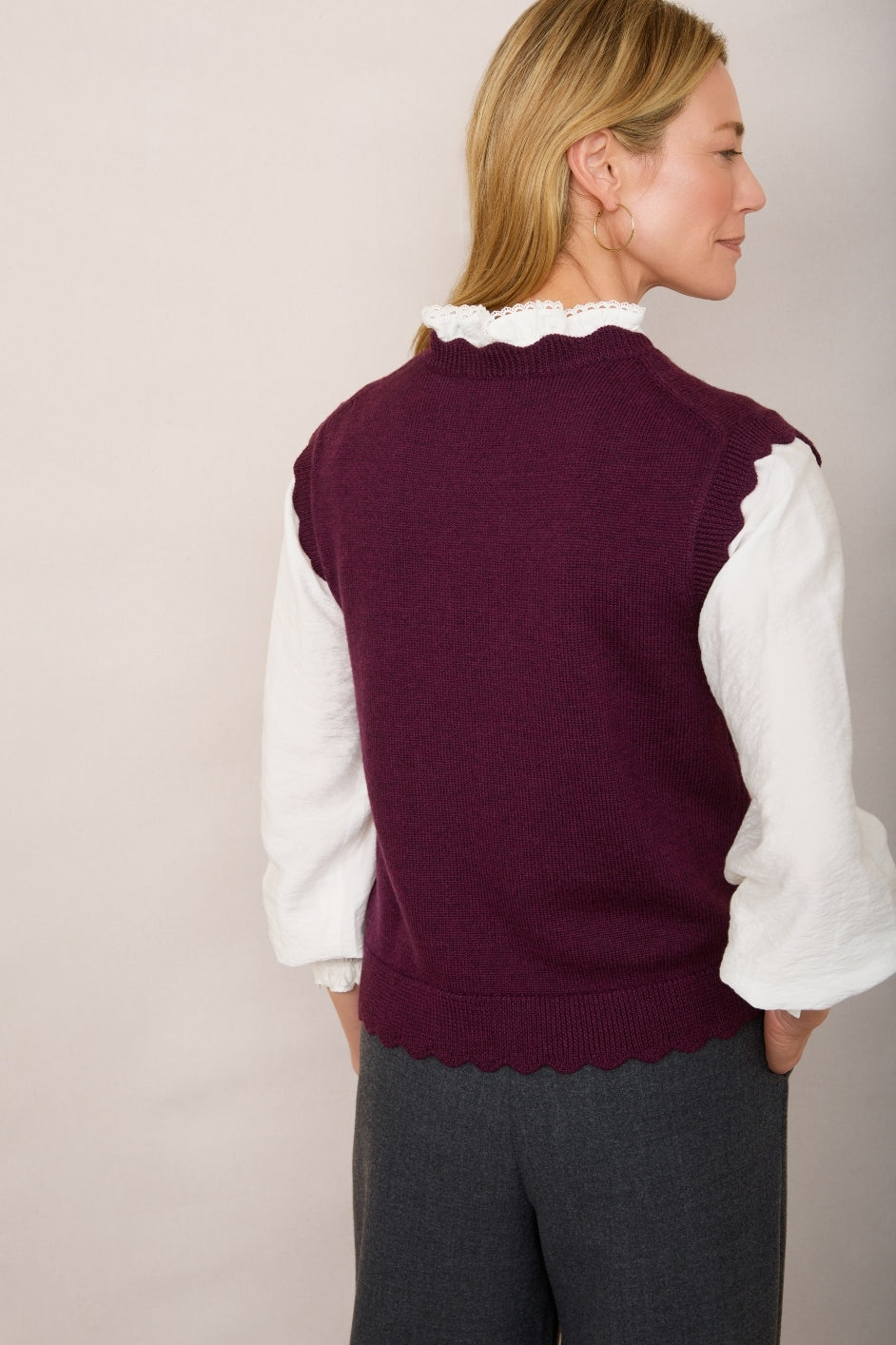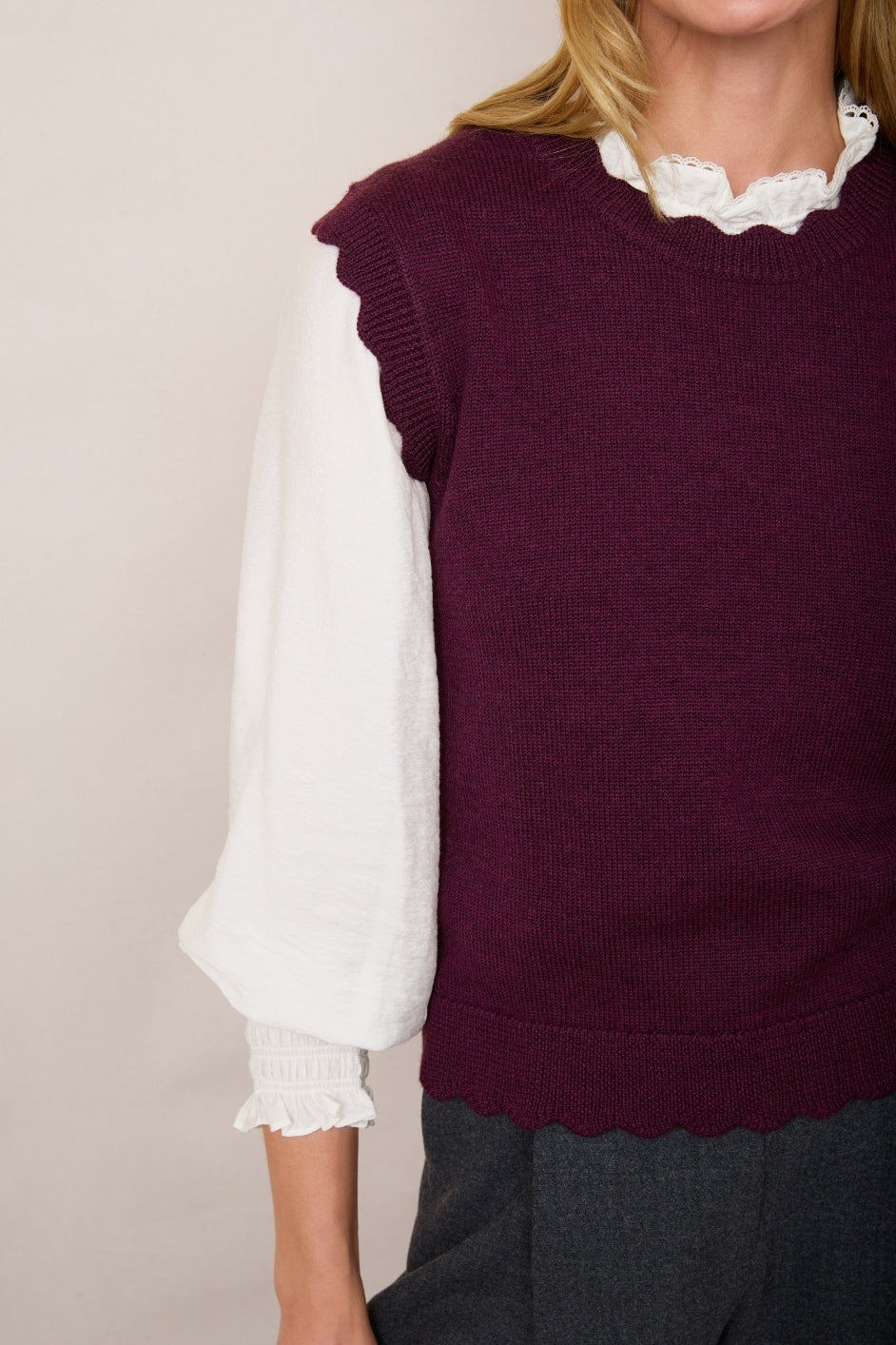 Scallop detail at the neck, hem and arms.