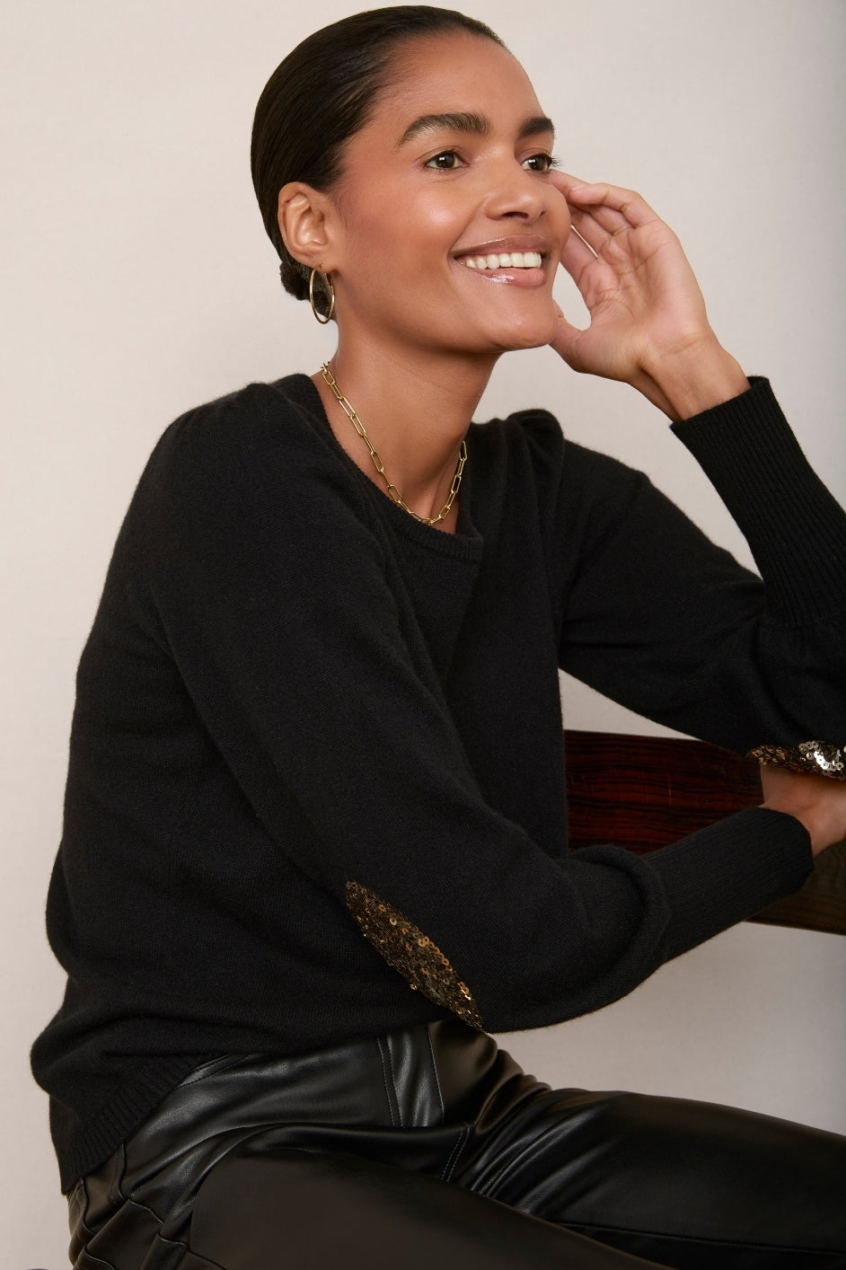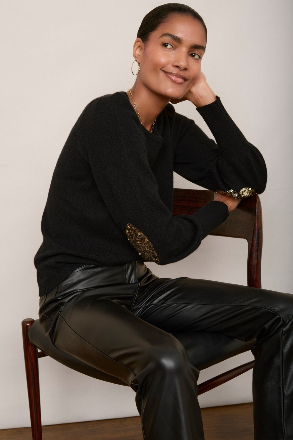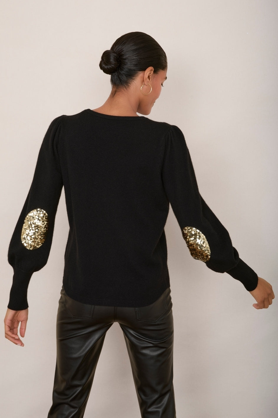 - Champagne gold sequin oval patches at the elbows – a uniquely Wyse detail.