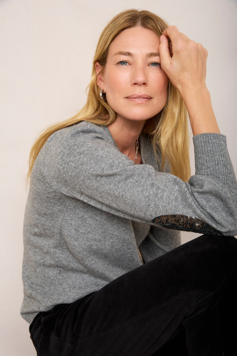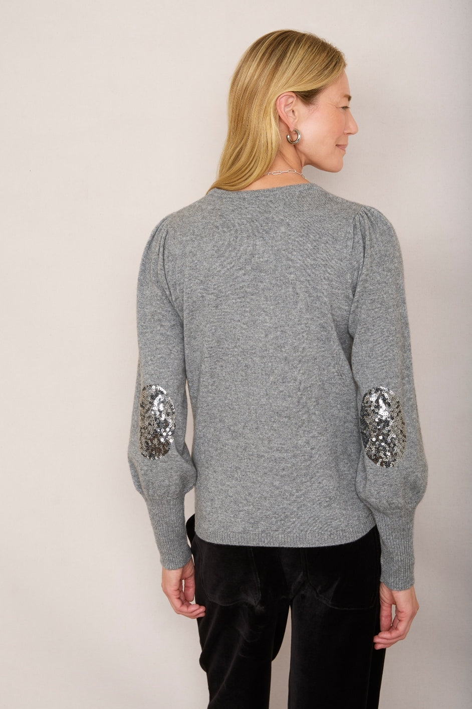 - Pewter sequin oval patches at the elbows – a uniquely Wyse detail.