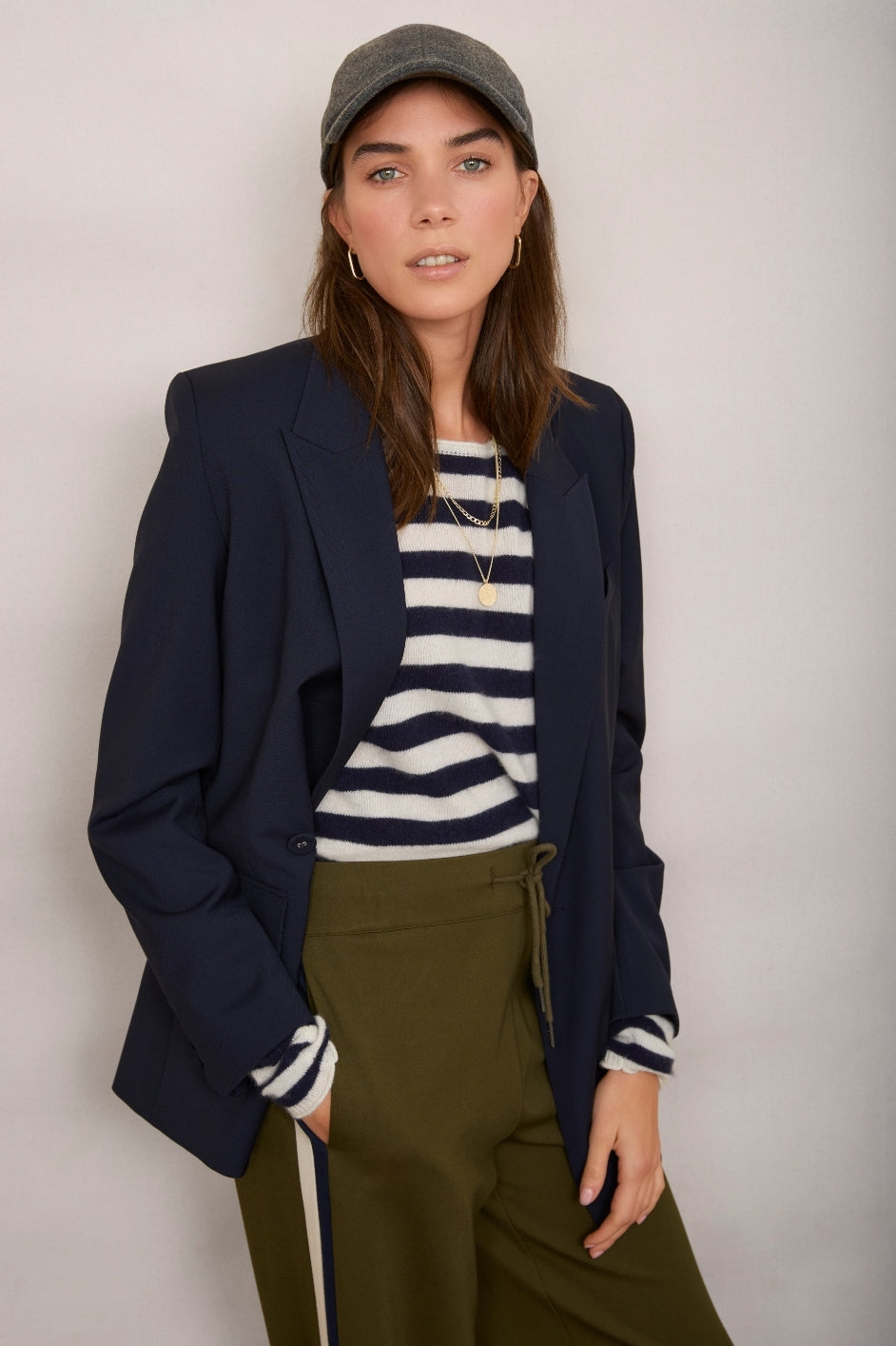 - This khaki option has a midnight & ivory stripe.
