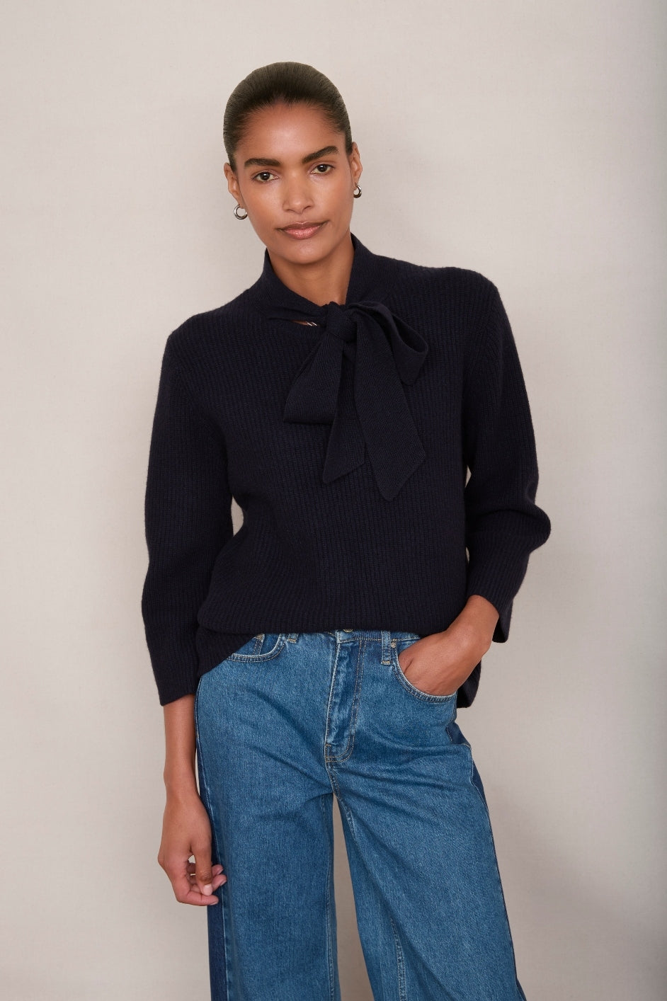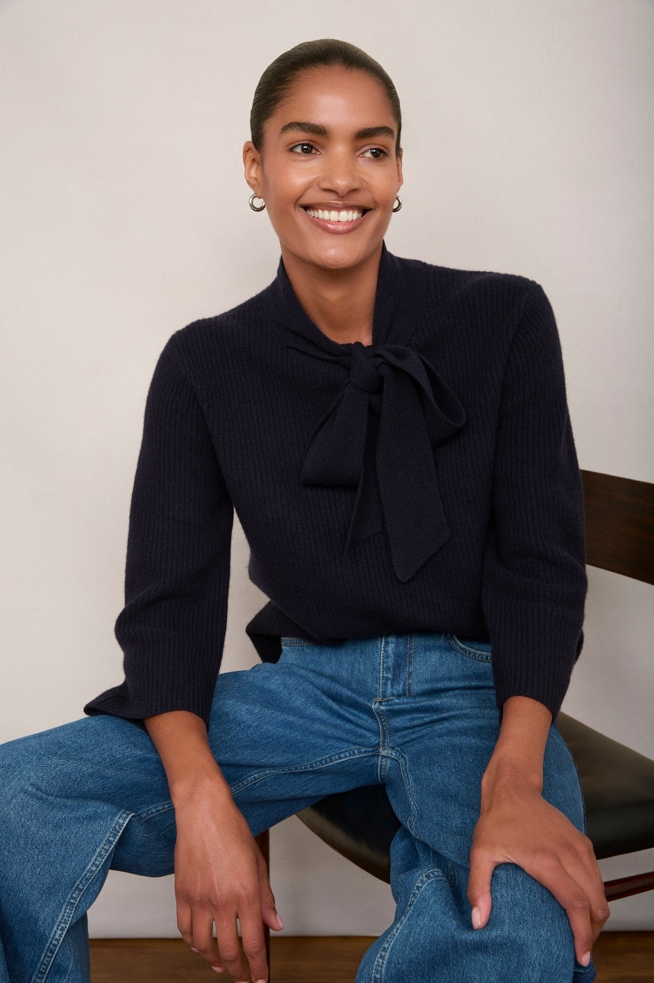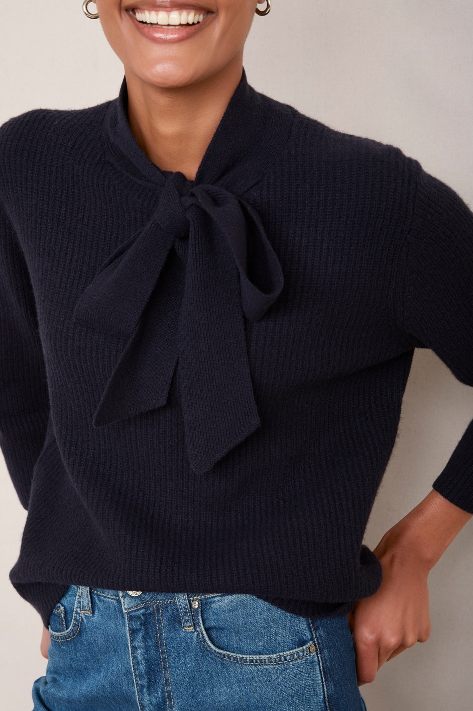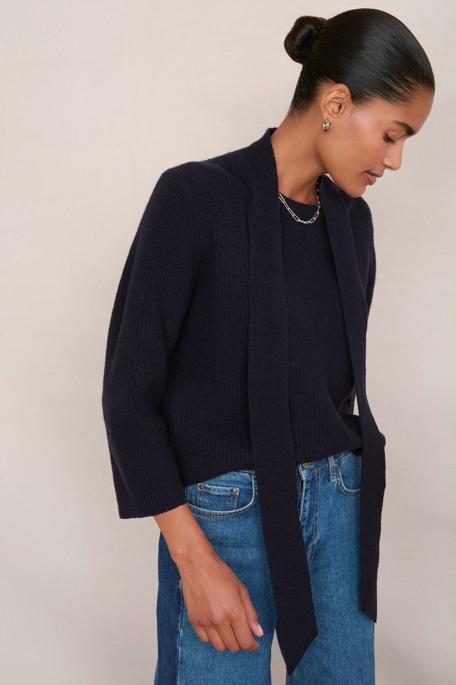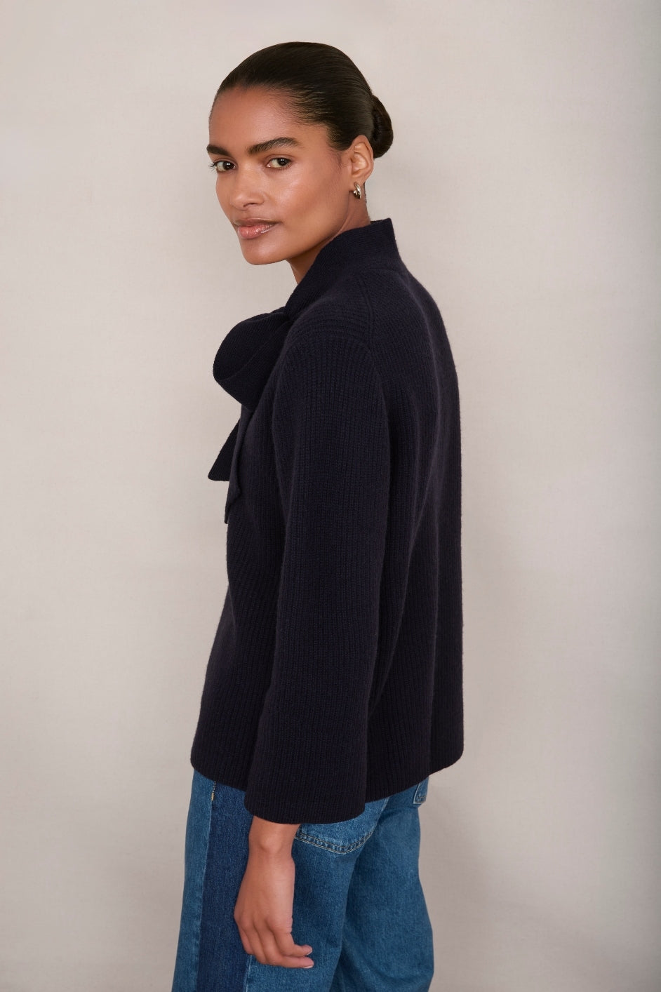 - A chic tie at the neck which can be worn open or closed or just folded over