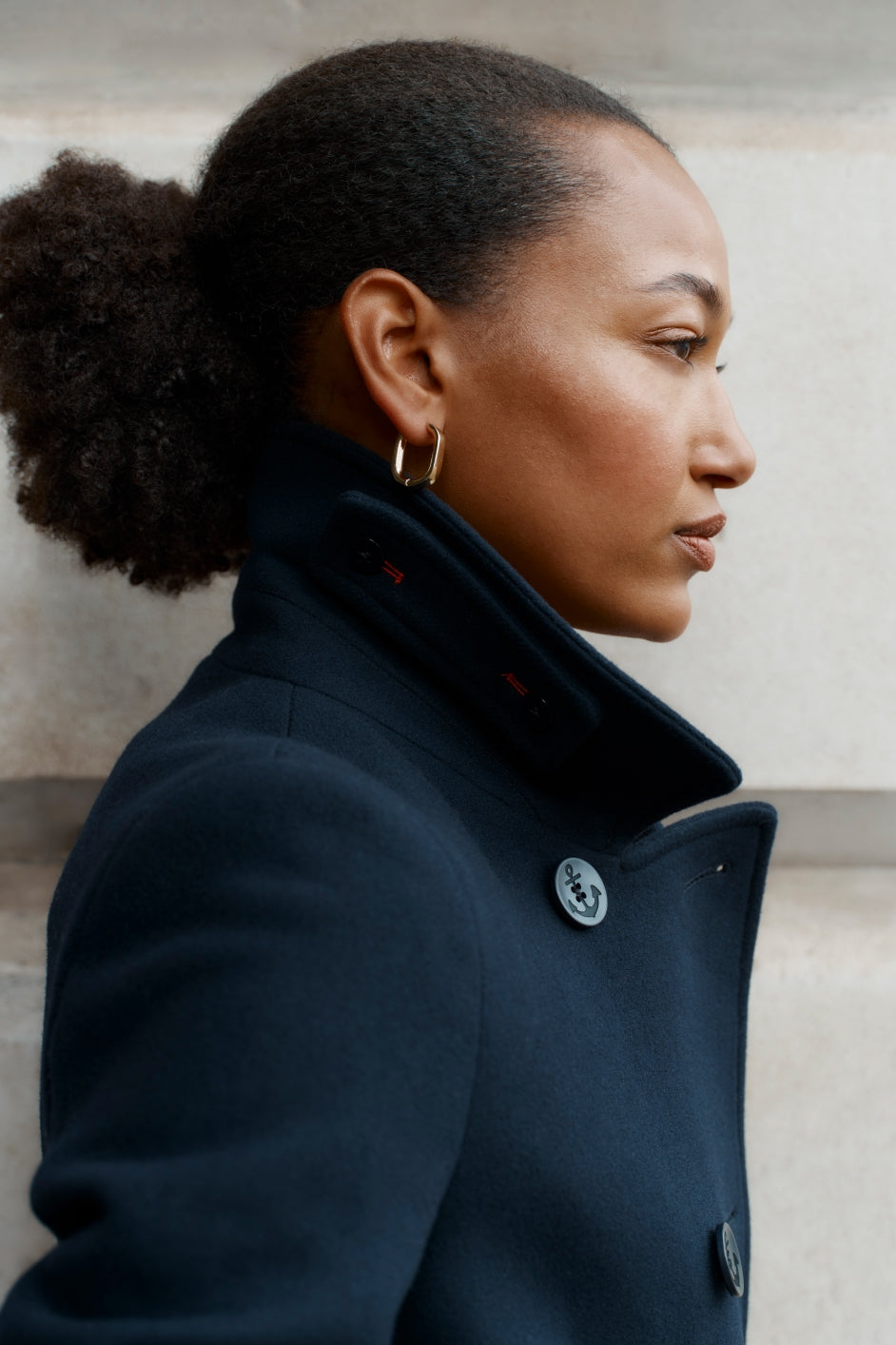 - Double breasted, with anchor buttons.