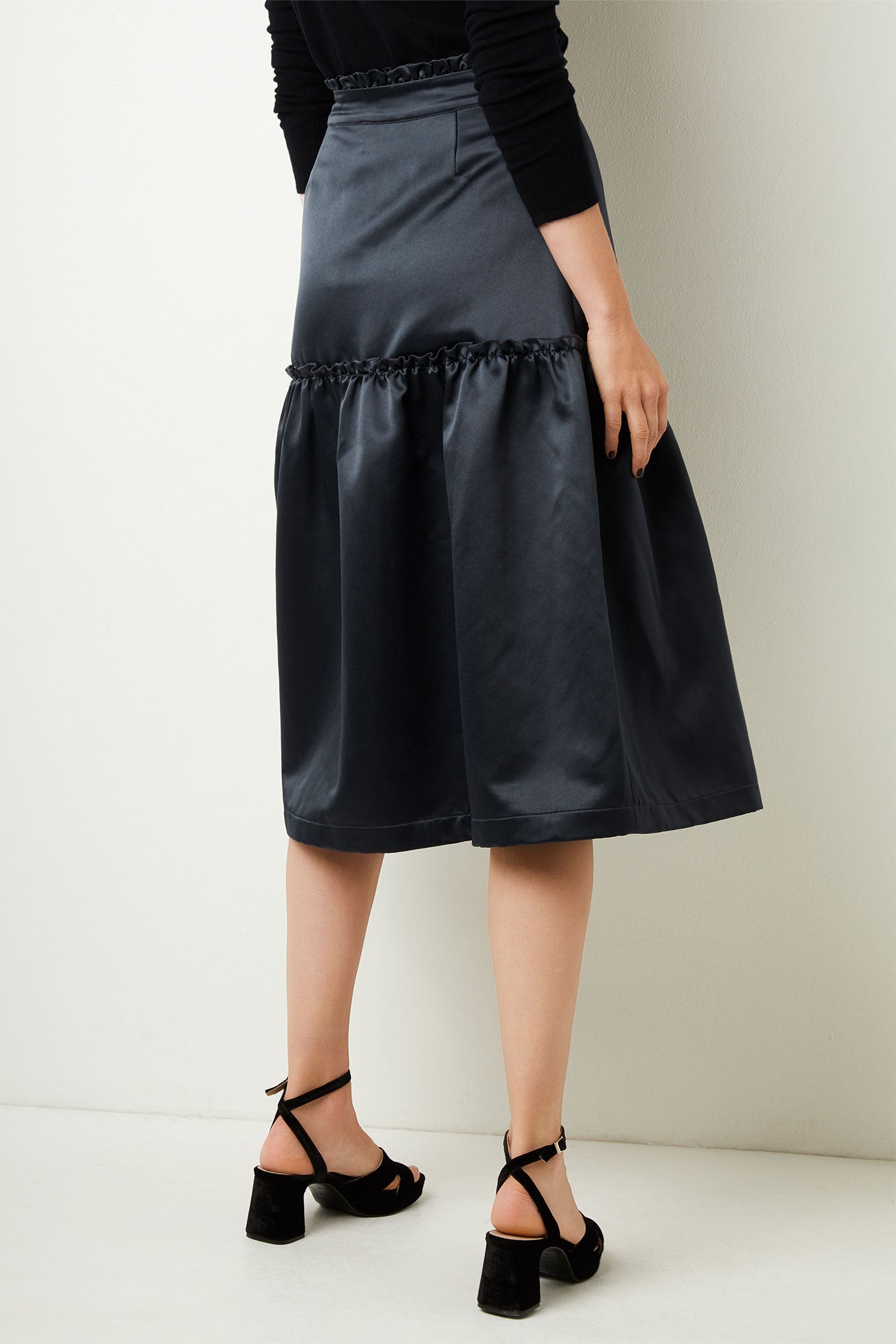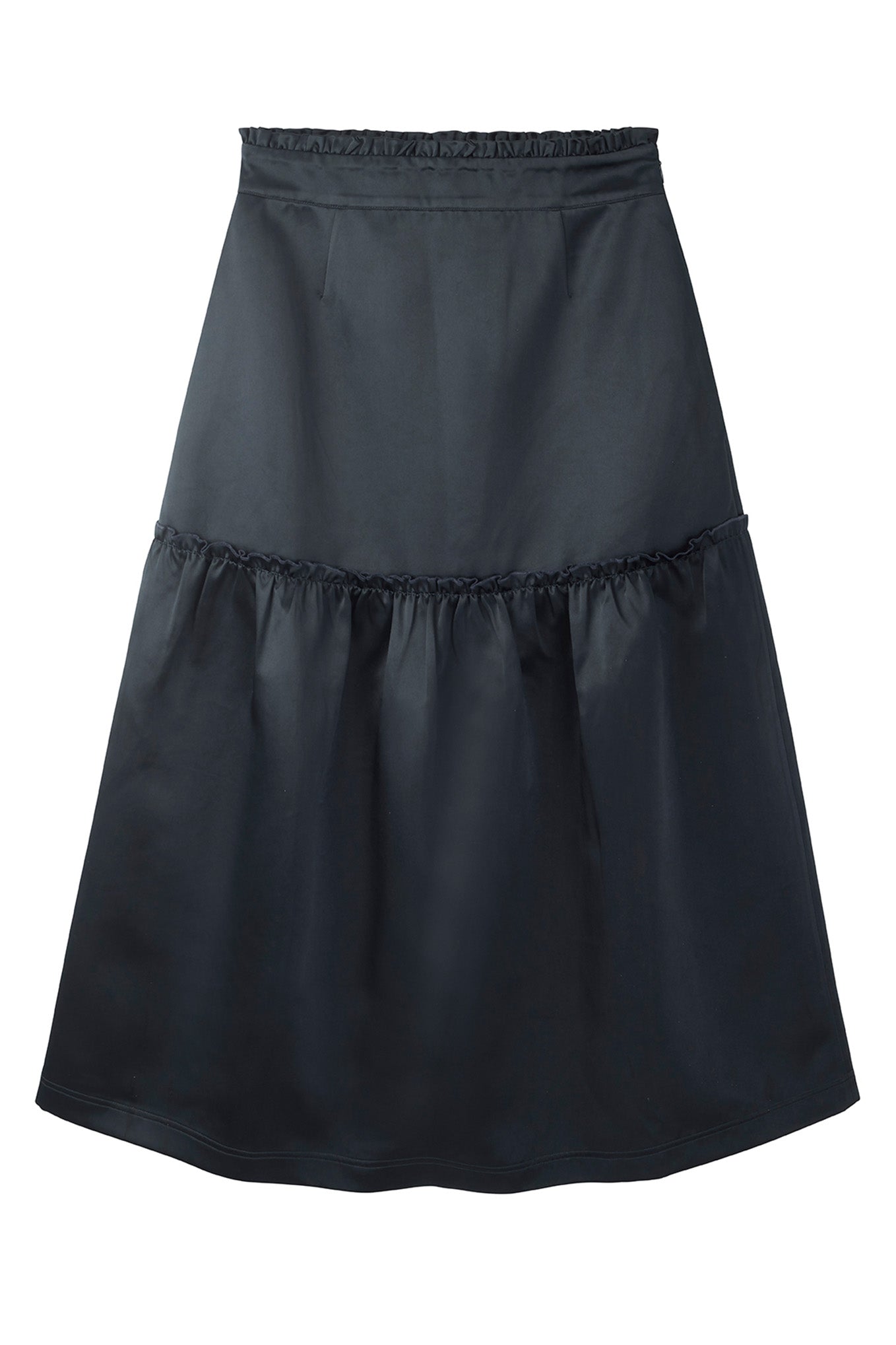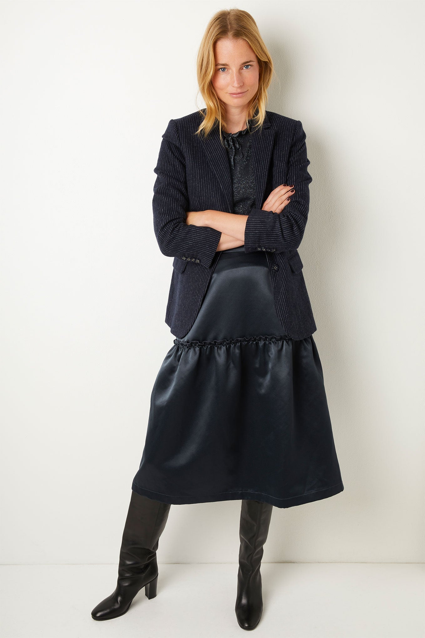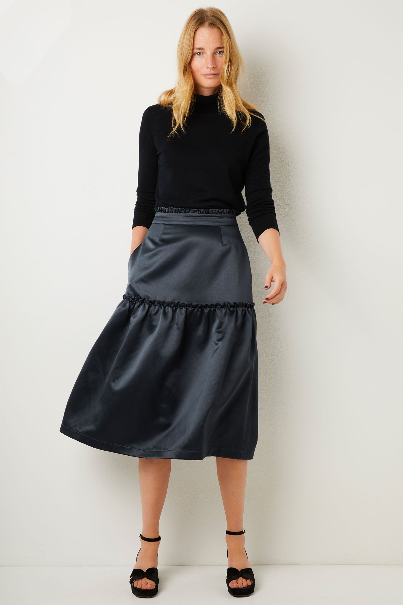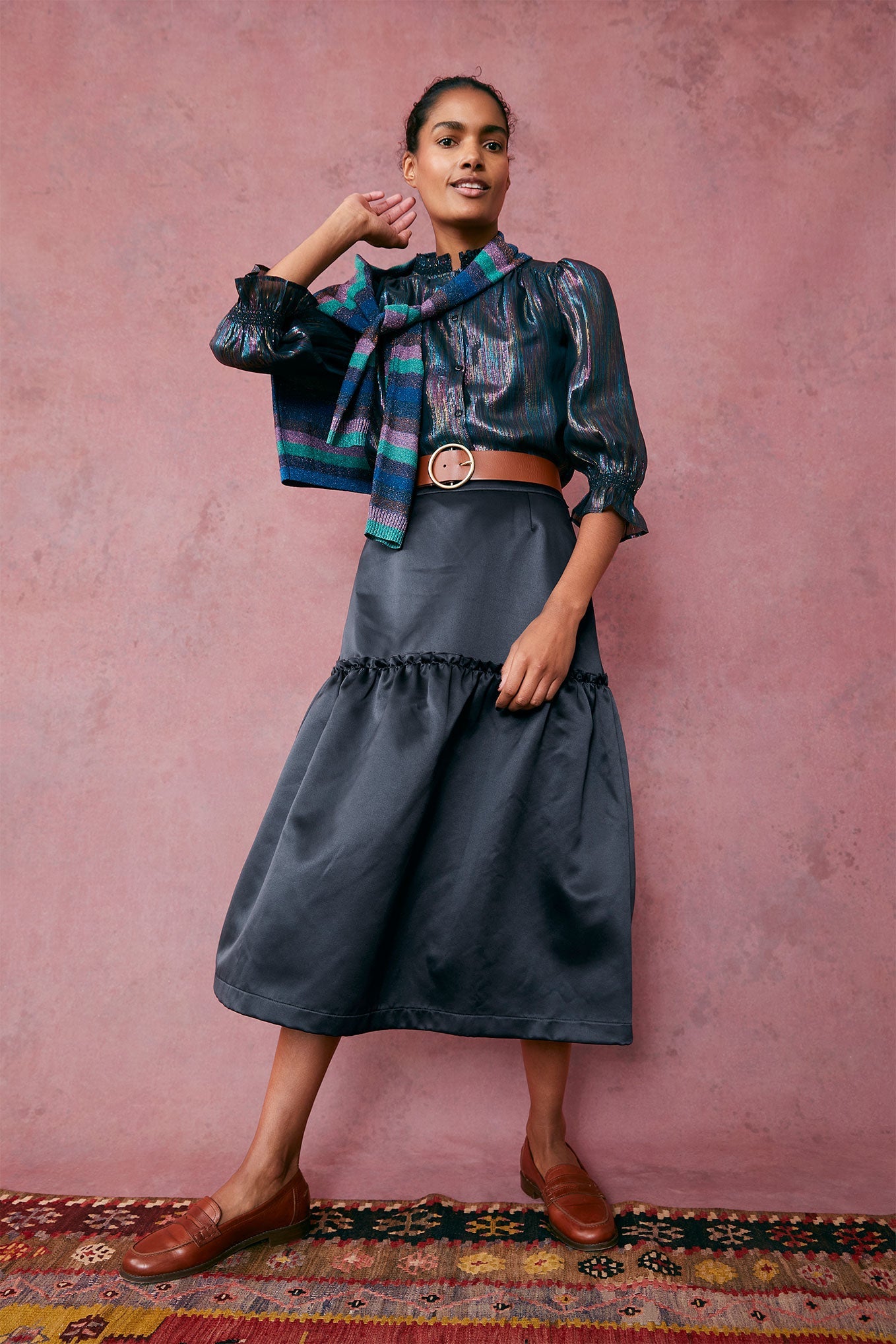 Our best-selling Saskia skirt is back for winter. Midi-length with a flat waistband and a ruffle-trimmed tier, it’s available in a clay shade and soon olive too. The stiff fabric creates a dramatic shape, which looks incredible with heels but also dressed down with trainers.