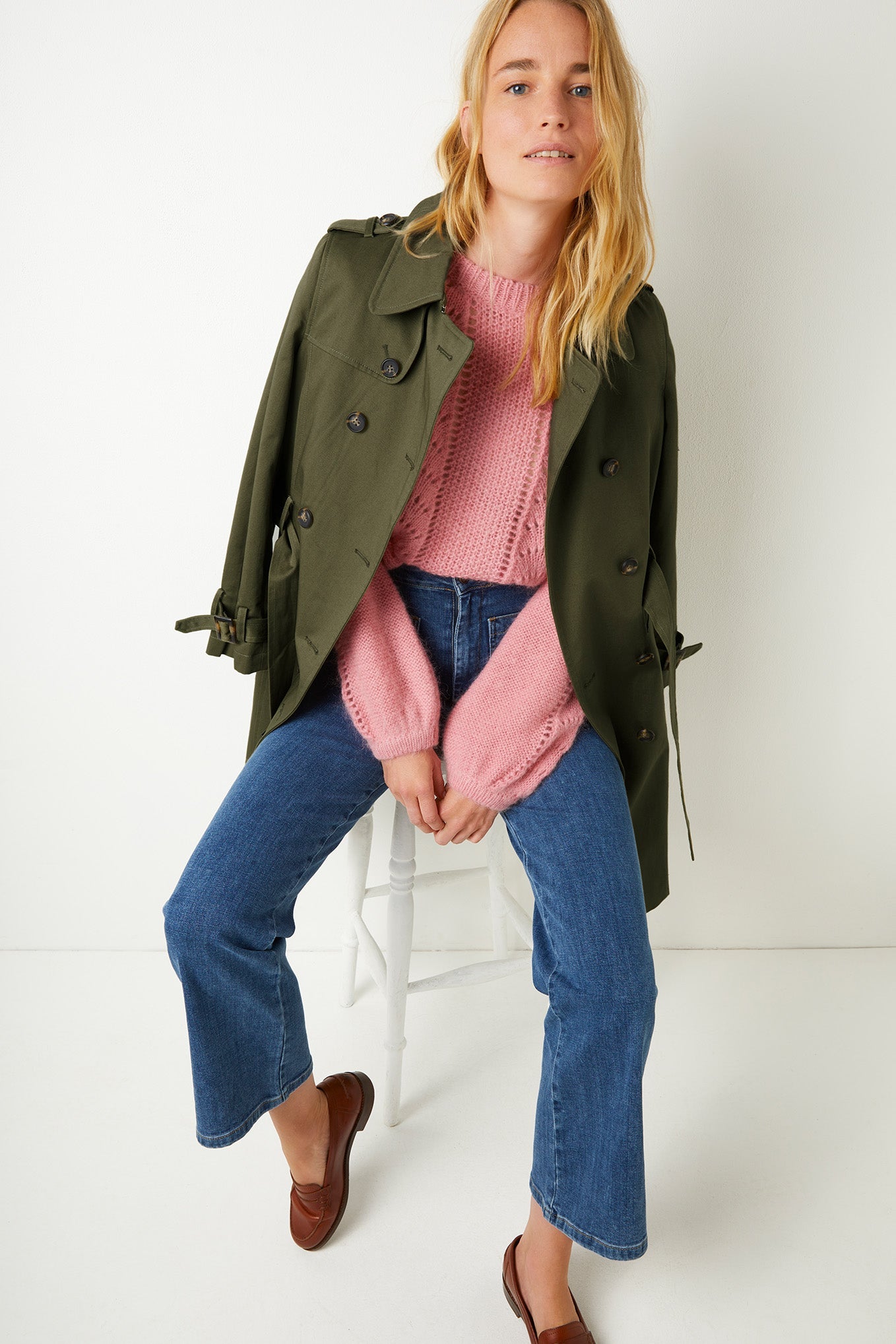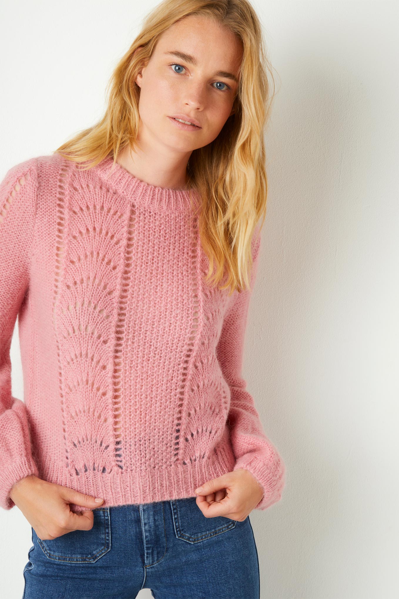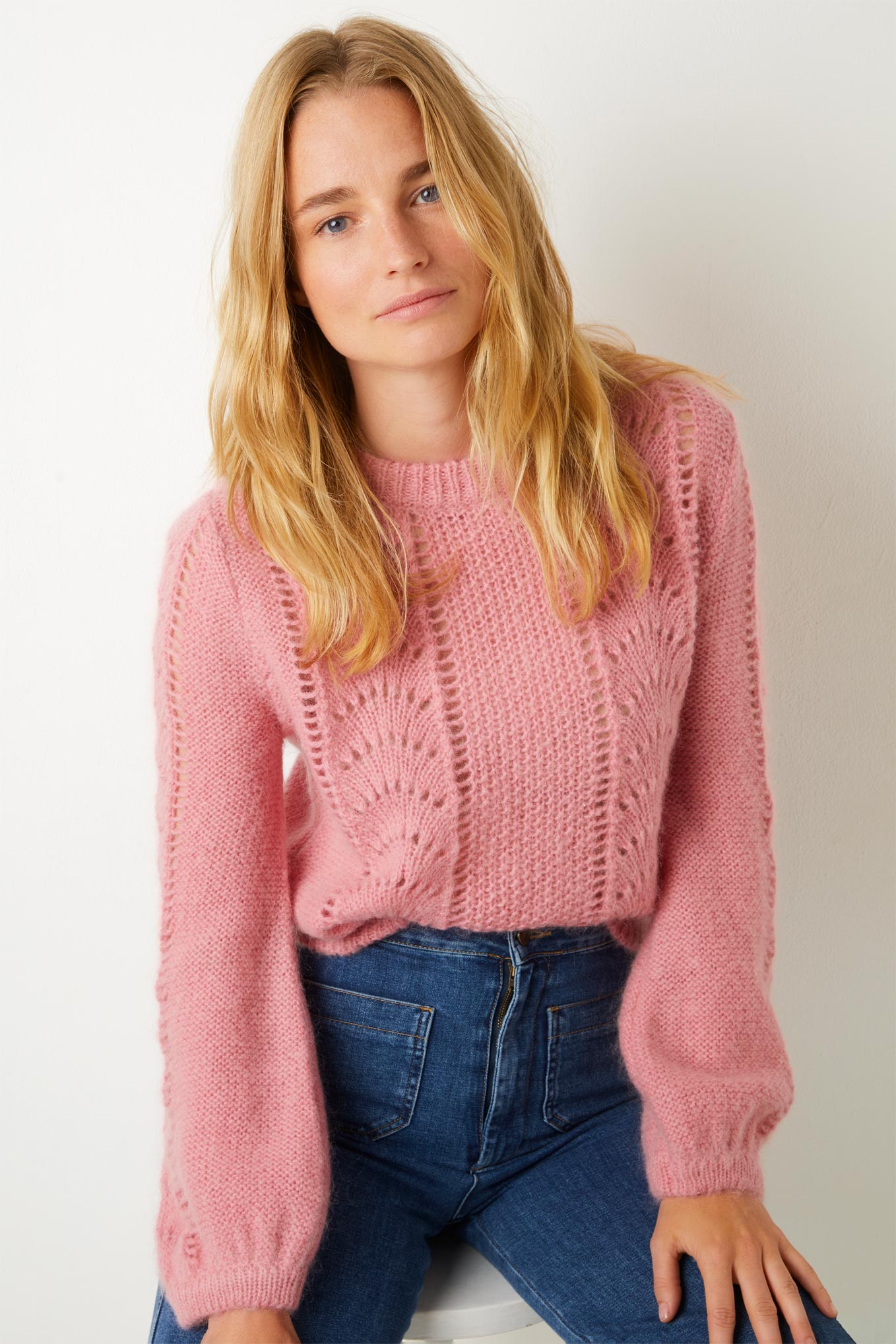 Give your wardrobe a sugar fix with Solene, our mohair-mix jumper. Deliciously fluffy with a stitch detail down the front, bell sleeves and a slightly cropped, boxy body shape. Available in soft pink and ivory.